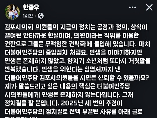 <사진설명=김포시의회 국민의힘 한종우 의원 SNS>[사진=팩트뉴스1]2025년 5월 24일, 김포시의회 국민의힘 소속 시의원들이 올해 들어 세 차례에 걸쳐 전액 부결된 추가경정예산안(추경) 사태에 대한