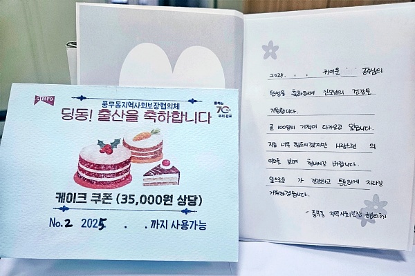 <사진설명=출산 축하 카드 >[사진출처=김포시 풍무동행정복지센터]-풍무동, 저소득 출산 가정에 전한 작은 선물…큰 감동-김포시 풍무동에서 갓 태어난 생명에게 전하는 따뜻한 축하 인사가 이