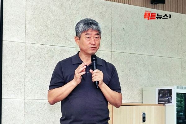 <사진설명=지난 7월 3일, 언론인들과의 간담회에서 이형록 김포도시관리공사 사장이 주요 사업에 대해 직접 질문에 답변하는 모습>[사진=팩트뉴스1]–한강시네폴리스·풍무역세권·메디컬캠퍼스