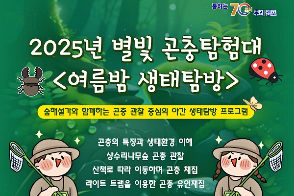 시는 7월 18일부터 9월 7일까지 매주 금·토요일 오후 7시 30분부터 9시까지 '별빛 곤충탐험대–여름밤 생태탐방' 프로그램을 운영한다고 9일 밝혔다. 프로그램은 김포시 모담공원 유아숲체험장에서 진행되며, 체험 중심의...