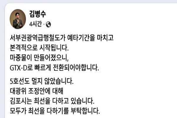 <사진설명=김병수 김포시장이 SNS 작성한 글>[사진출처=김병수 김포시장 SNS]-GTX-B와 연계해 여의도·용산·서울역·청량리까지 직결--GTX-D 조기 추진의 교두보 될까-김포시를 시작으로 서울 도심까