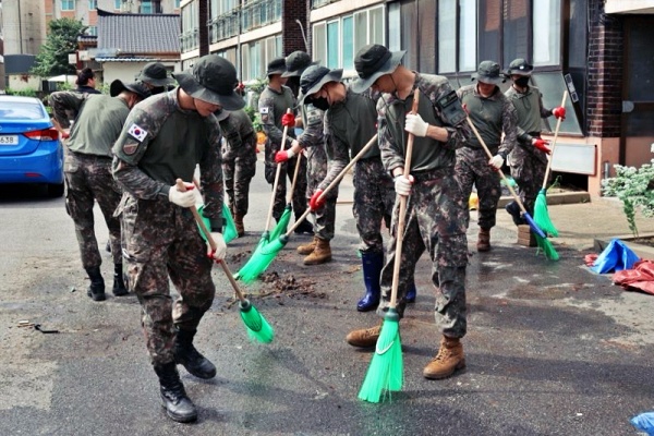 장병들은 무더운 날씨에도 아랑곳하지 않고 침수 피해를 입은 주민들을 위해 지하의 고인 물과 토사를 제거하고, 젖은 가재도구를 정리하느라...
