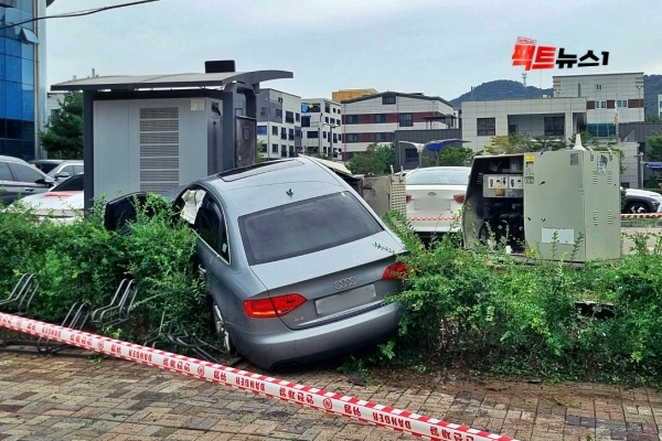 <사진설명=차량이 변압기에 충돌한 모습>[사진=팩트뉴스1]9일 오전 김포생활체육관에서 정전이 발생해 이용객 전원이 긴급하게 퇴장하는 상황이 벌어졌다.정전은 오전 11시 35분경 발생했다. 1952