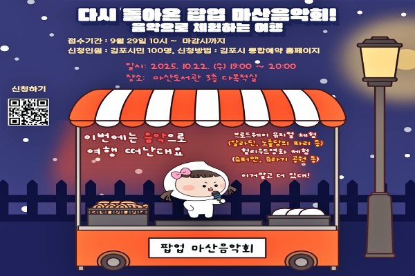 <사진설명=팝업 마산음악회 홍보이미지>[사진출처=김포시]김포 마산도서관이 오는 10월부터 특별기획 시리즈 ‘위기를 극복하는 힘’을 선보인다. 이번 시리즈는 가족, 자기탐색, 연대라는 세