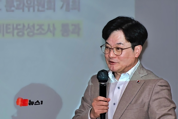 <사진설명=김병수 시장이 5호선 연장 사업의 예비타당성조사 통과에 대해 설명하고, 앞으로의 추진 계획을 밝히고 있다.>[사진=팩트뉴스1]서울지하철 5호선 김포·검단 연장 사업이 예비타당성조